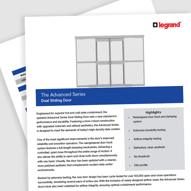 View all at Legrand.comLegrand’s sliding containment doors are engineered to enclose data center server aisles to prevent the mixing of hot and cold air. As a key component of the containment solution, they optimize airflow, improve energy efficiency, maintain ideal equipment temperatures, and enhance overall cooling performance. Their modular, space-saving design also allows for easy installation and seamless integration with existing containment systems.