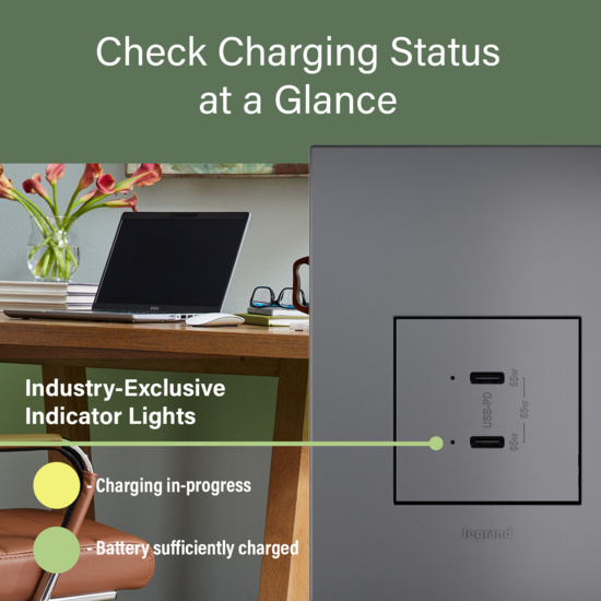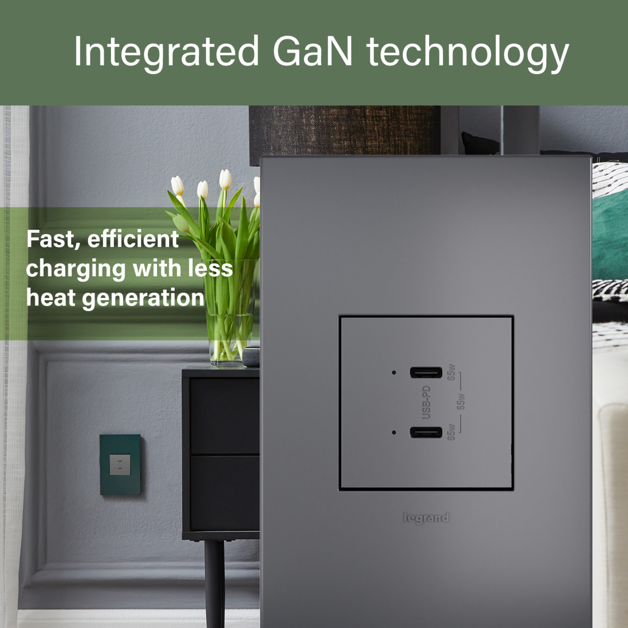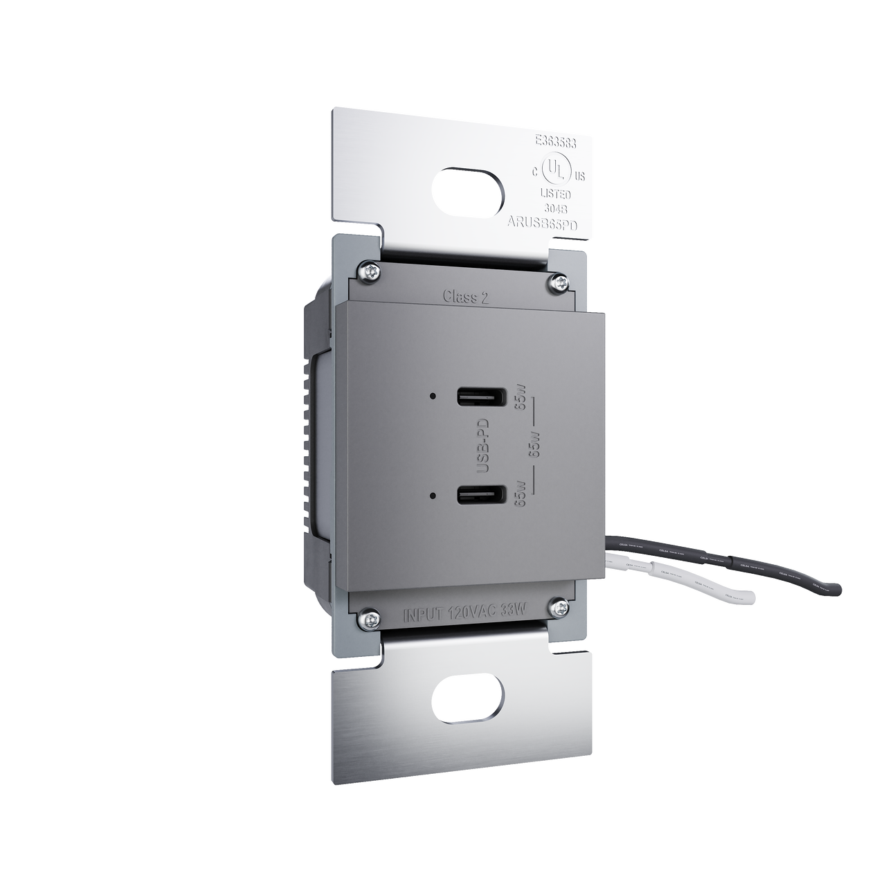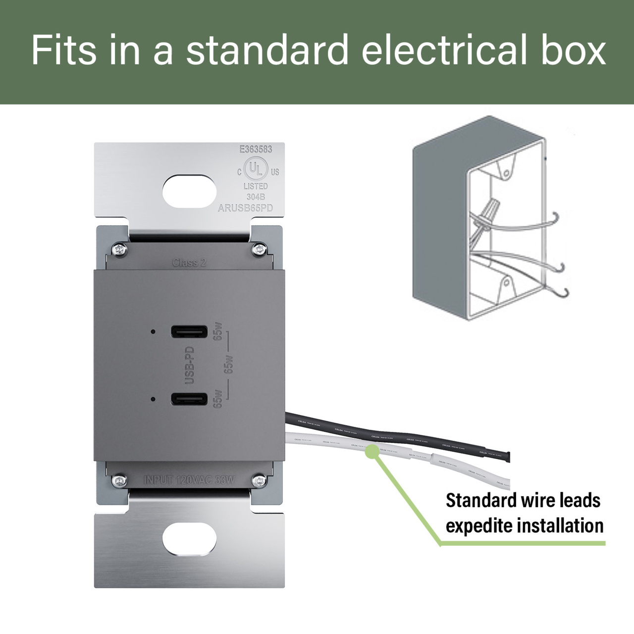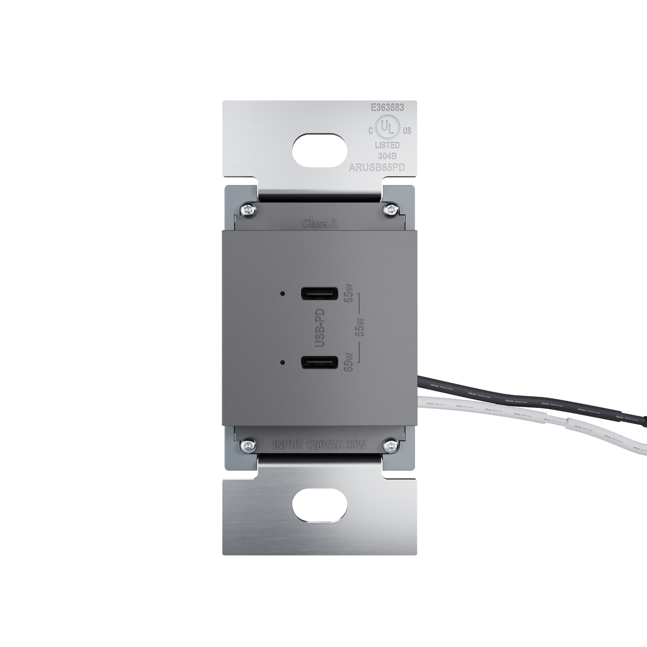 Featuring two USB Type-C ports with industry-leading 65W of power each, this device provides the fastest USB charging for phones, tablets and laptops. Advanced Power Delivery provides intelligent charging that negotiates optimal voltage and current between the outlet and the device being charged. Easily replaces a traditional outlet in as little as ten minutes. Enjoy USB charging functionality in every room of your home with the unique adorne contemporary aesthetic. Made exclusively for use with screwless wall plates from the adorne® Collection, sold separately.