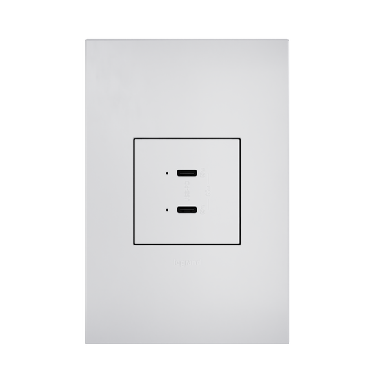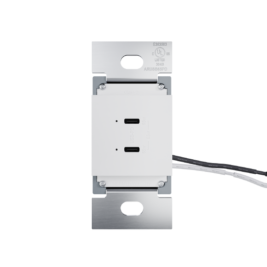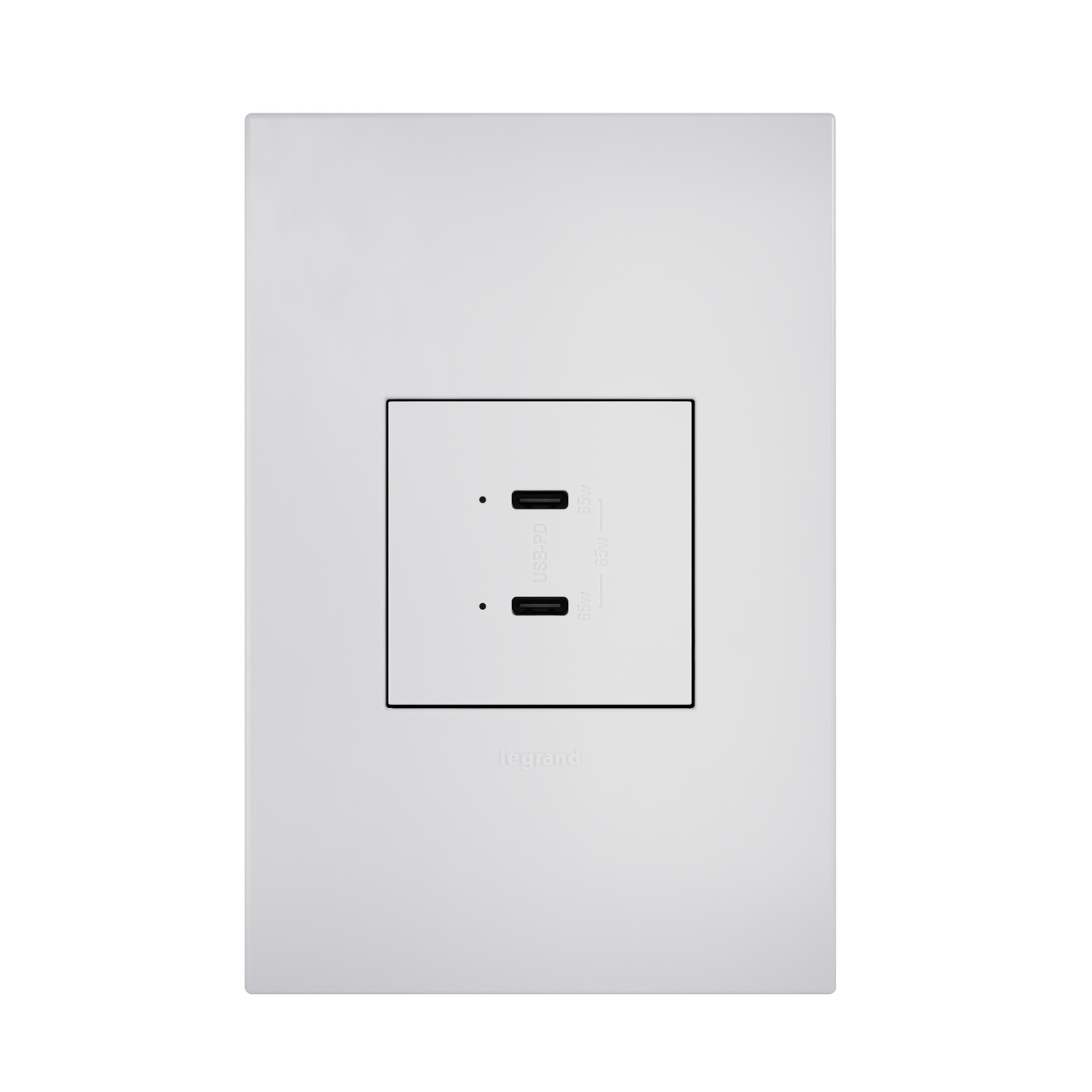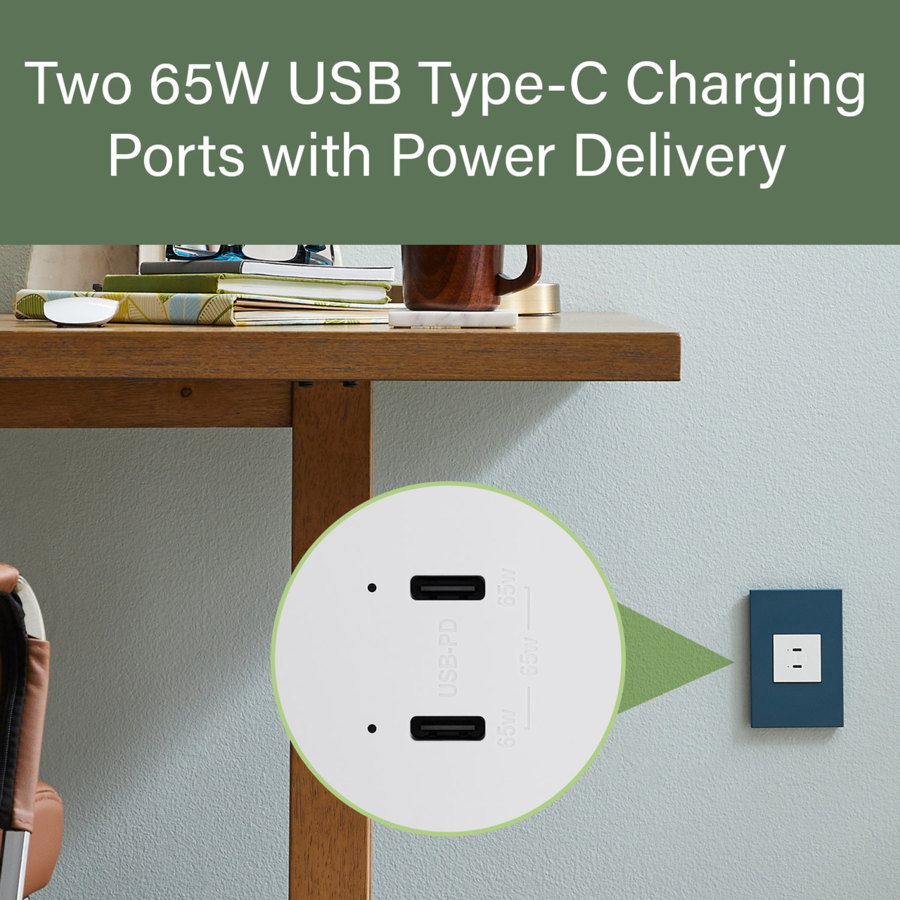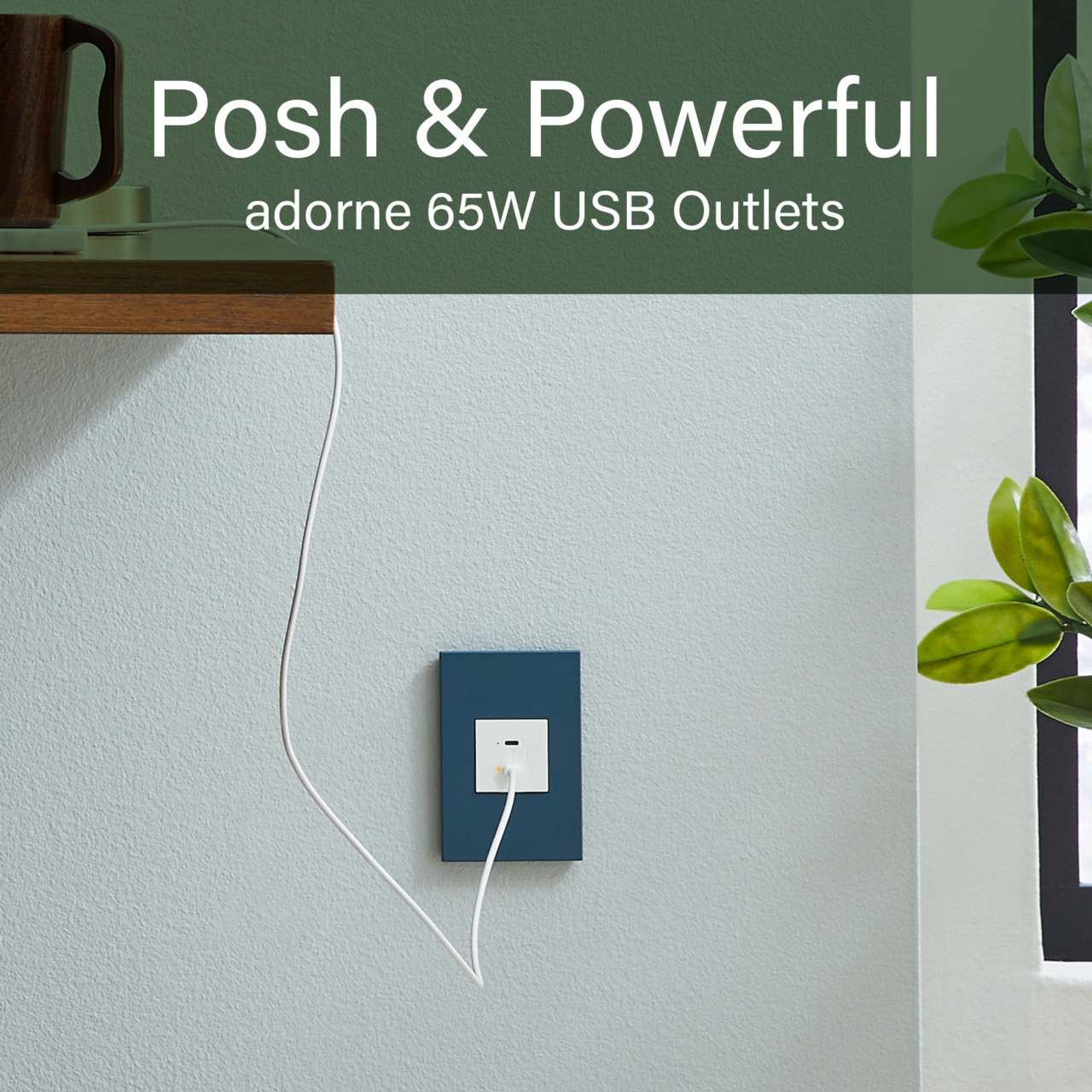 Featuring two USB Type-C ports with industry-leading 65W of power each, this device provides the fastest USB charging for phones, tablets and laptops. Advanced Power Delivery provides intelligent charging that negotiates optimal voltage and current between the outlet and the device being charged. Easily replaces a traditional outlet in as little as ten minutes. Enjoy USB charging functionality in every room of your home with the unique adorne contemporary aesthetic. Made exclusively for use with screwless wall plates from the adorne® Collection, sold separately.