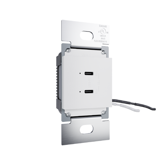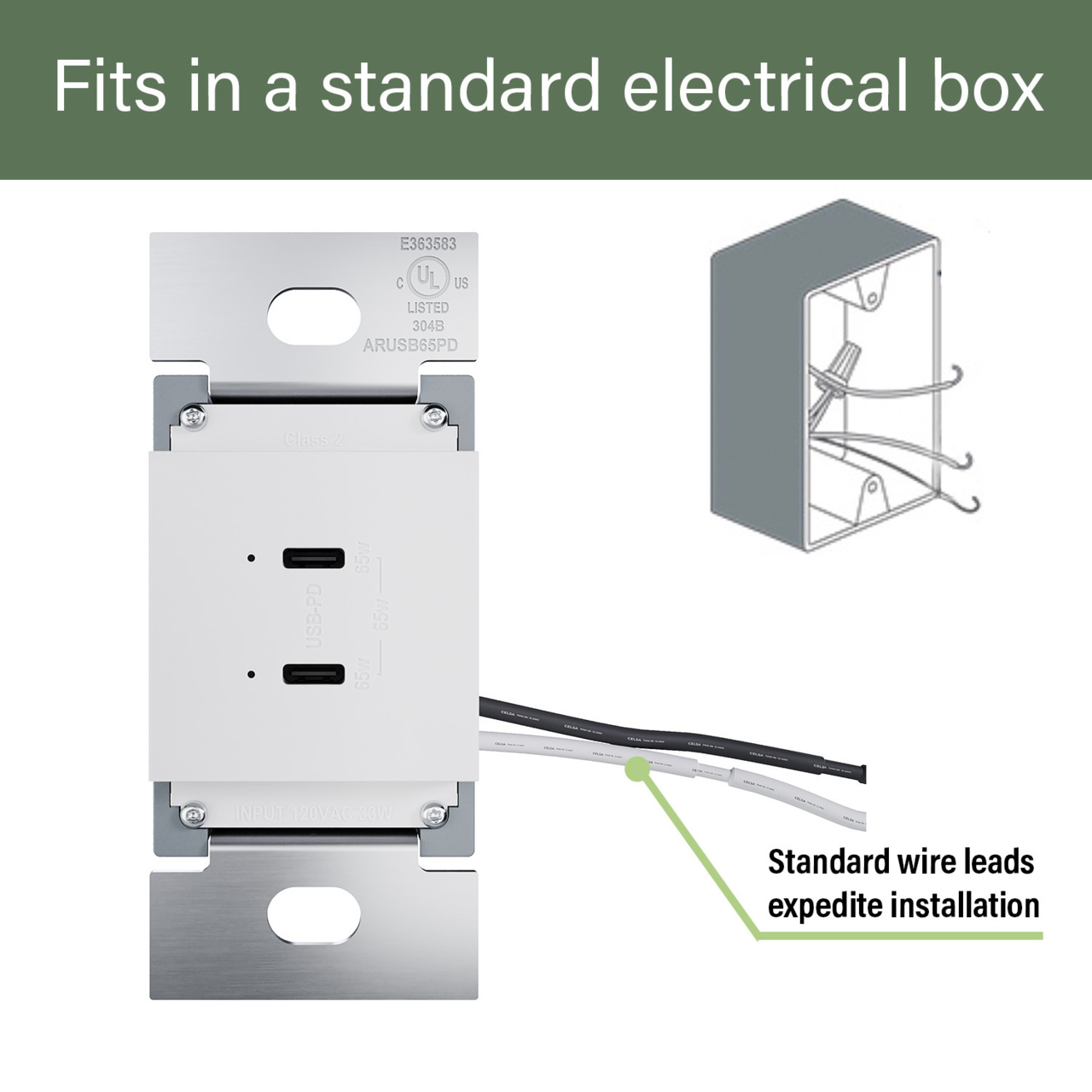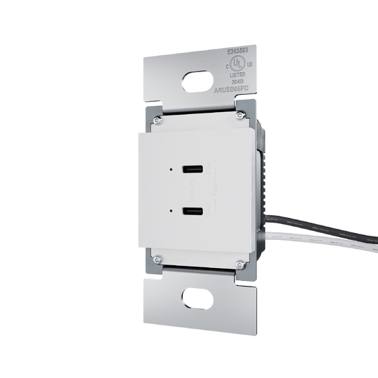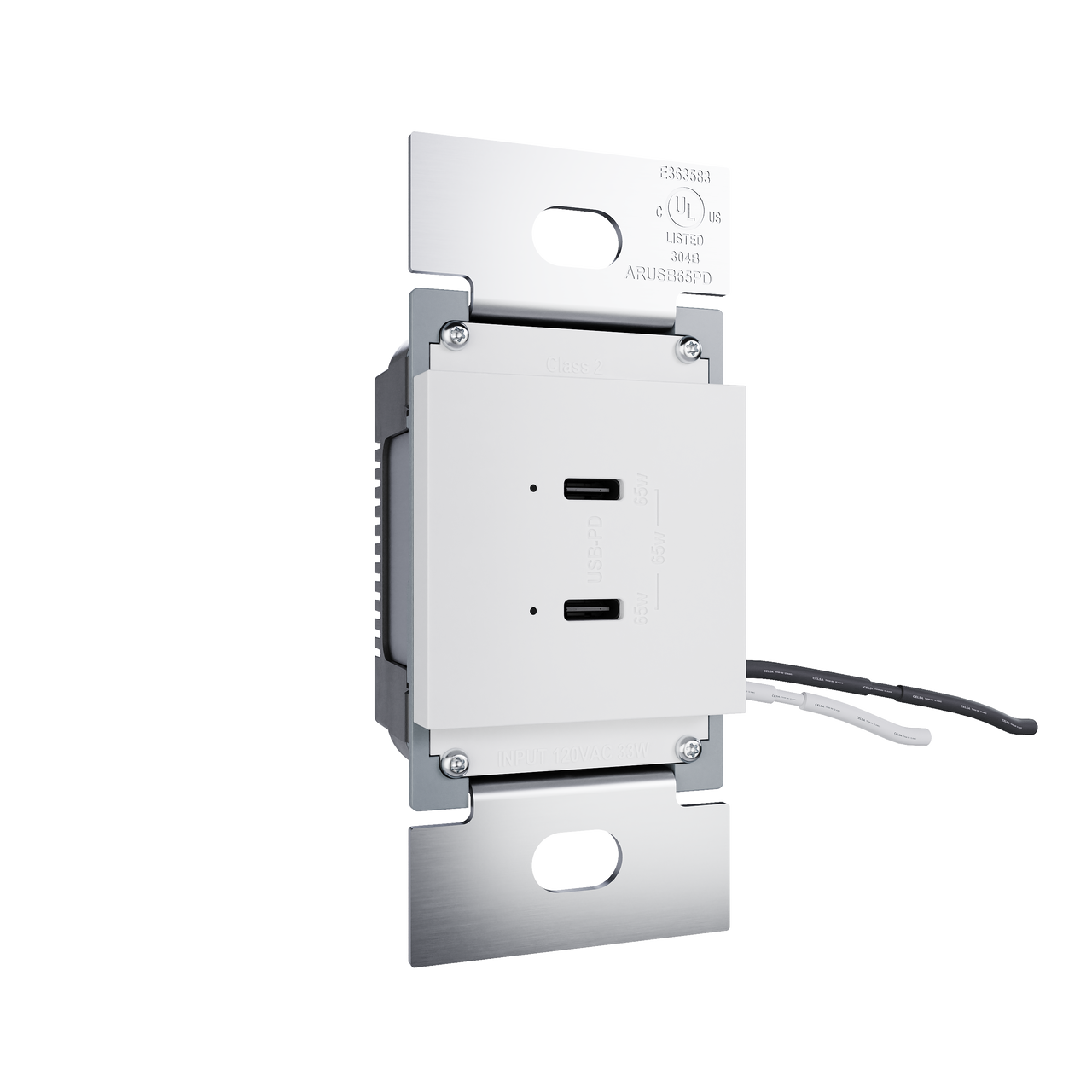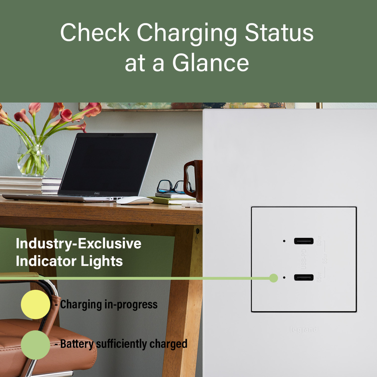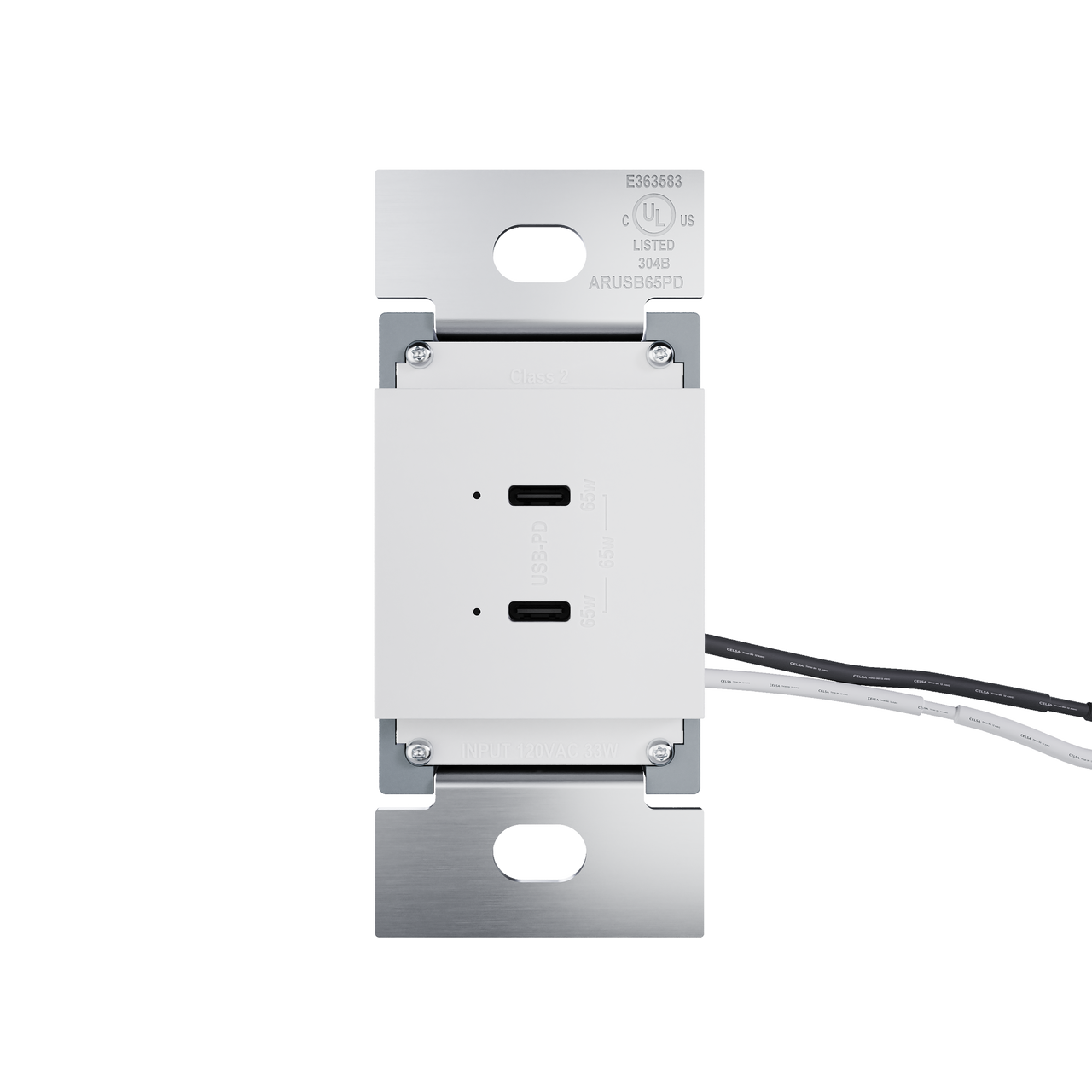Featuring two USB Type-C ports with industry-leading 65W of power each, this device provides the fastest USB charging for phones, tablets and laptops. Advanced Power Delivery provides intelligent charging that negotiates optimal voltage and current between the outlet and the device being charged. Easily replaces a traditional outlet in as little as ten minutes. Enjoy USB charging functionality in every room of your home with the unique adorne contemporary aesthetic. Made exclusively for use with screwless wall plates from the adorne® Collection, sold separately.