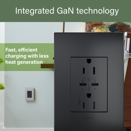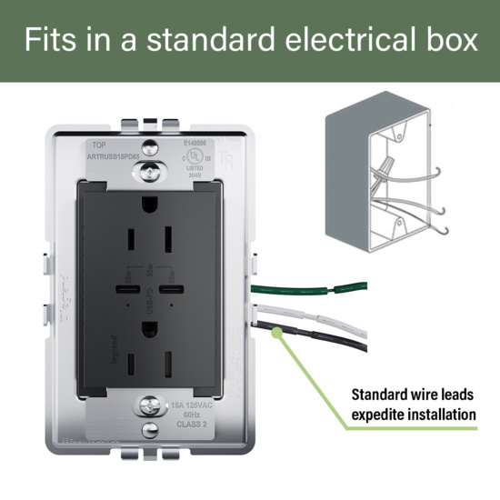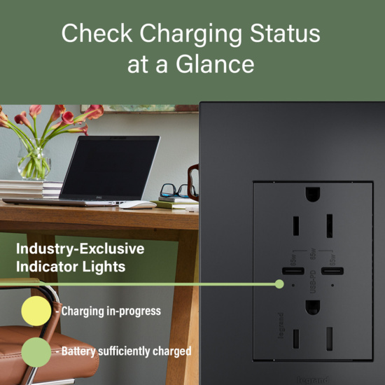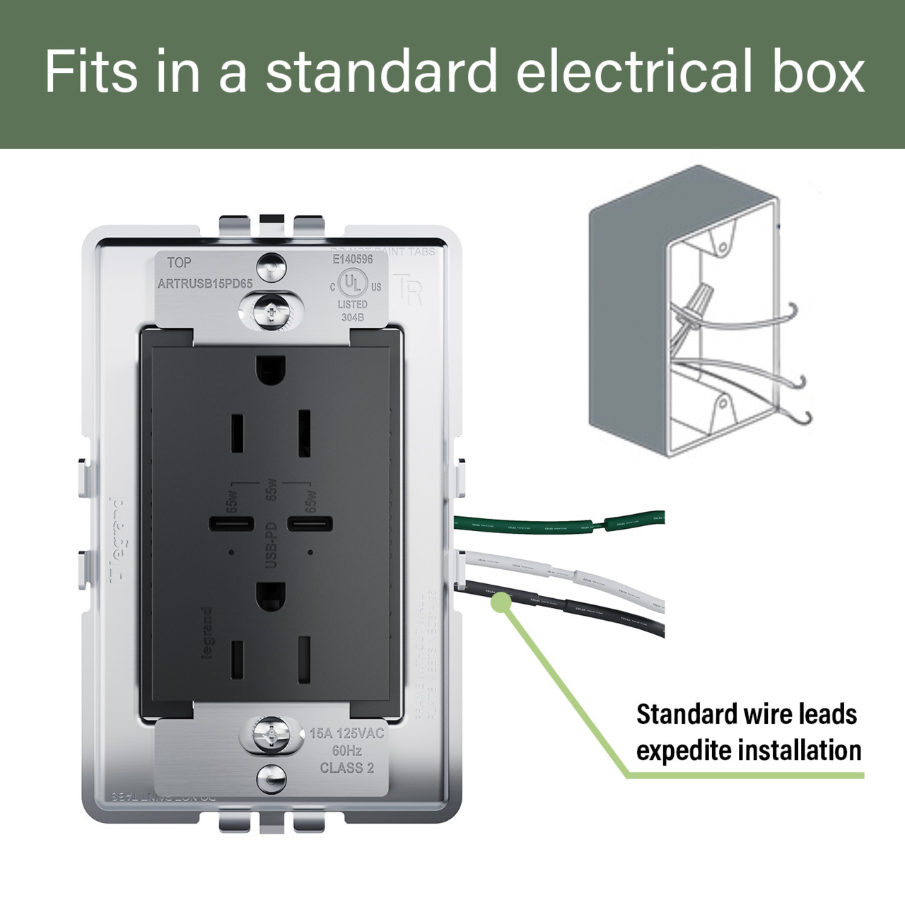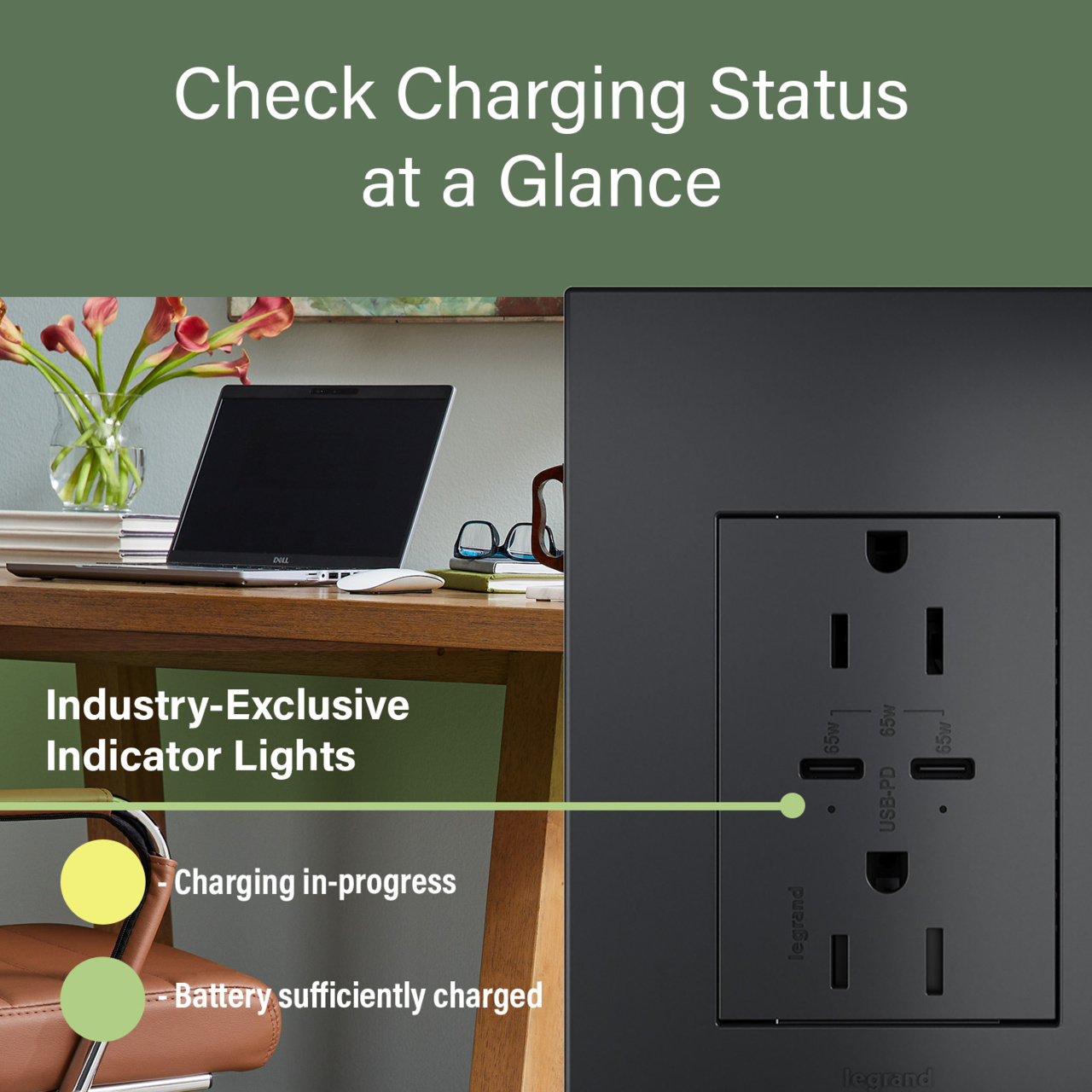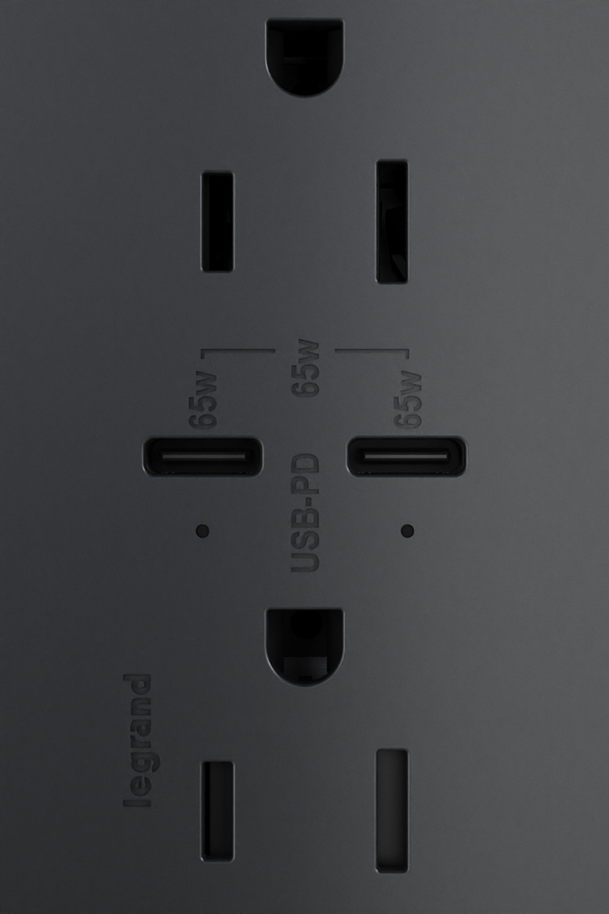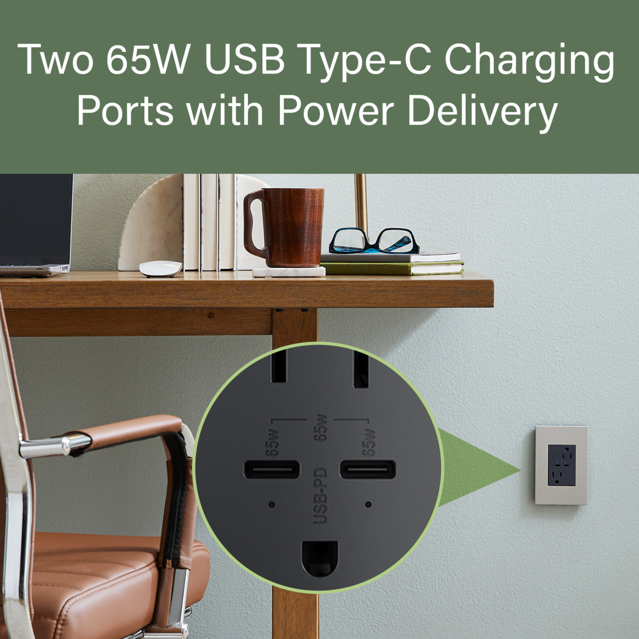 Features dual Type-C charging ports with 65W each, providing the fastest USB charging for phones, tablets and laptops. Includes two 15-amp AC receptacles. Advanced Power Delivery provides intelligent charging that negotiates optimal voltage and current between the outlet and the device being charged. Easily replaces a traditional outlet in as little as ten minutes. Enjoy USB charging functionality in every room of your home with the unique adorne contemporary aesthetic. Made exclusively for use with plus-size, screwless wall plates from the adorne® Collection, sold separately.