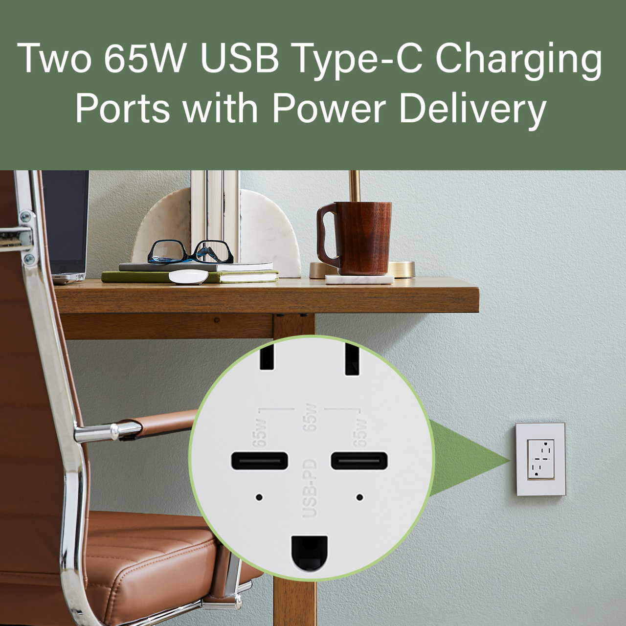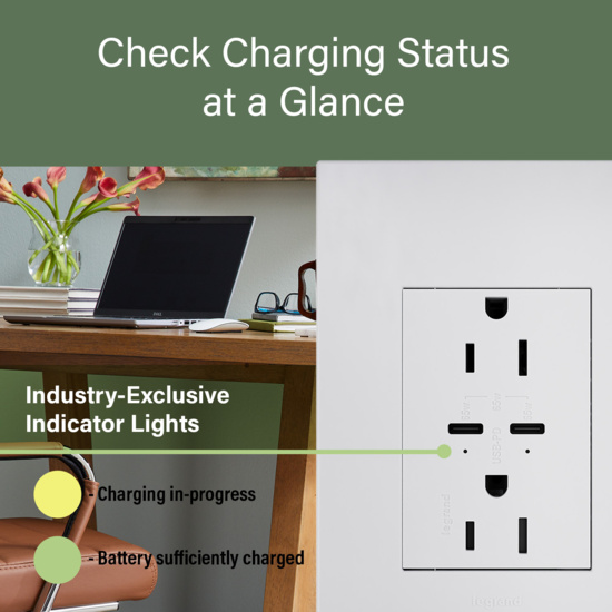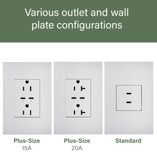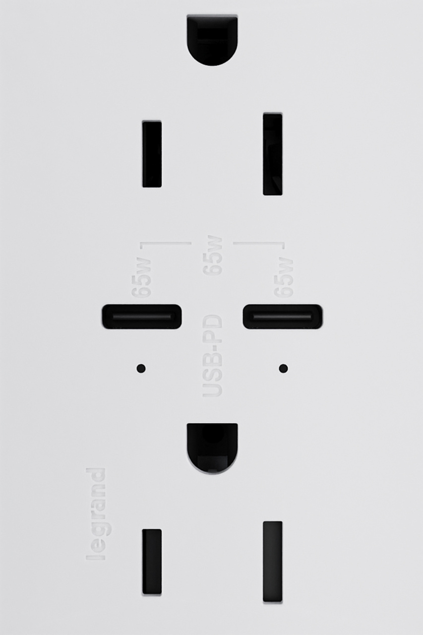 Features dual Type-C charging ports with 65W each, providing the fastest USB charging for phones, tablets and laptops. Includes two 15-amp AC receptacles. Advanced Power Delivery provides intelligent charging that negotiates optimal voltage and current between the outlet and the device being charged. Easily replaces a traditional outlet in as little as ten minutes. Enjoy USB charging functionality in every room of your home with the unique adorne contemporary aesthetic. Made exclusively for use with plus-size, screwless wall plates from the adorne® Collection, sold separately.