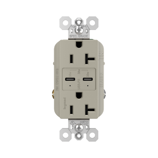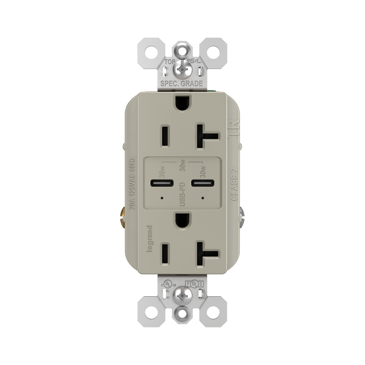 Spec Grade 30W USB Outlet, Type C, 20A, Tamper-Resistant, Nickel