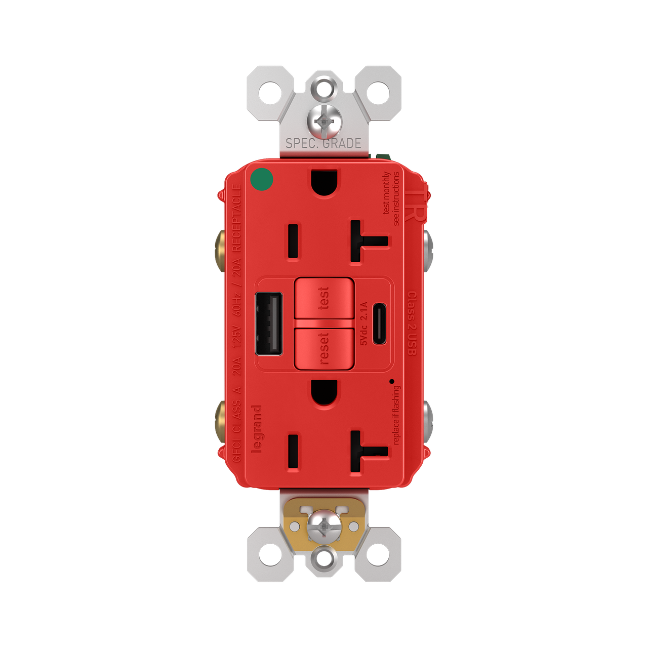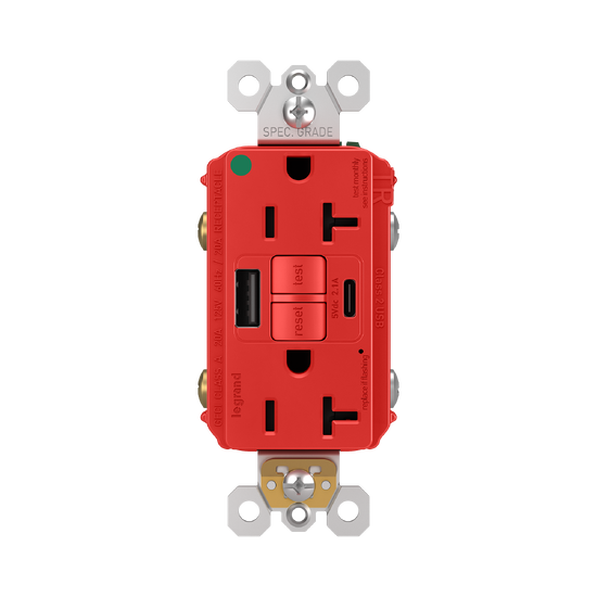 radiant® Hospital Grade GFCI USB Outlet with SafeLock® Protection, Type A/C, 20A, Tamper-Resistant, Red