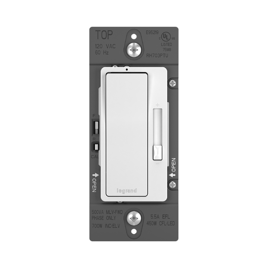Upgrade your space with superior dimming control and exceptional style. The radiant® Tru-Universal Dimmer works with virtually any 120V dimmable bulb or fixture, adjusting to the precise light level you want, without the flicker. Unsure what dimmer your bulb needs? Avoid uncertainty with Tru-Universal Dimming. Part of the radiant® Collection, it also features clean lines and smooth control for a sophisticated touch. Made exclusively for use with screwless Wall Plates from the radiant® Collection, sold separately.