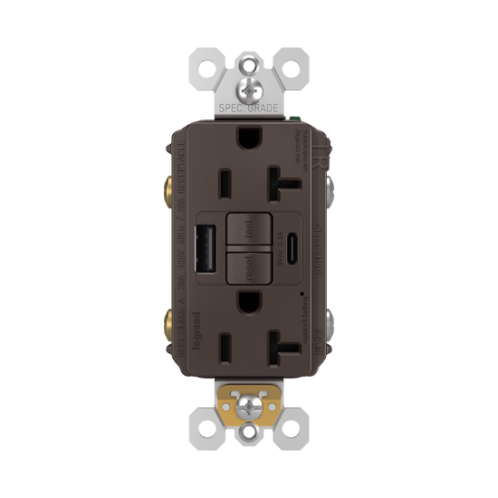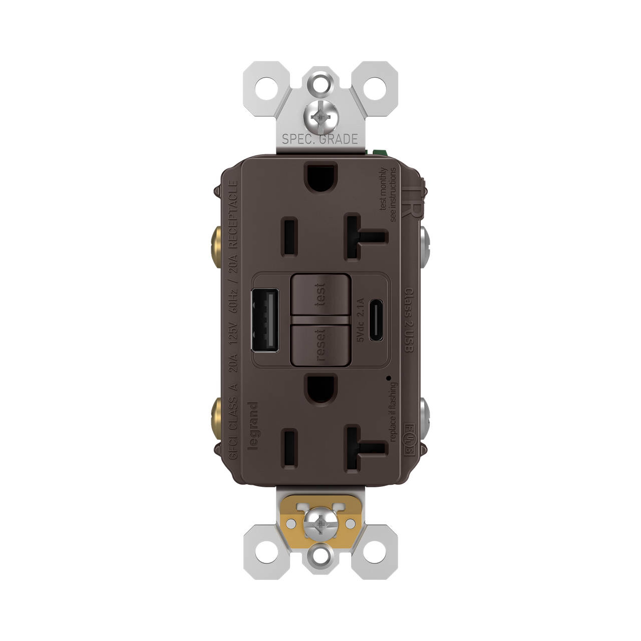 radiant® GFCI USB Outlet with SafeLock® Protection, Type A/C, 20A, Tamper-Resistant, Brown