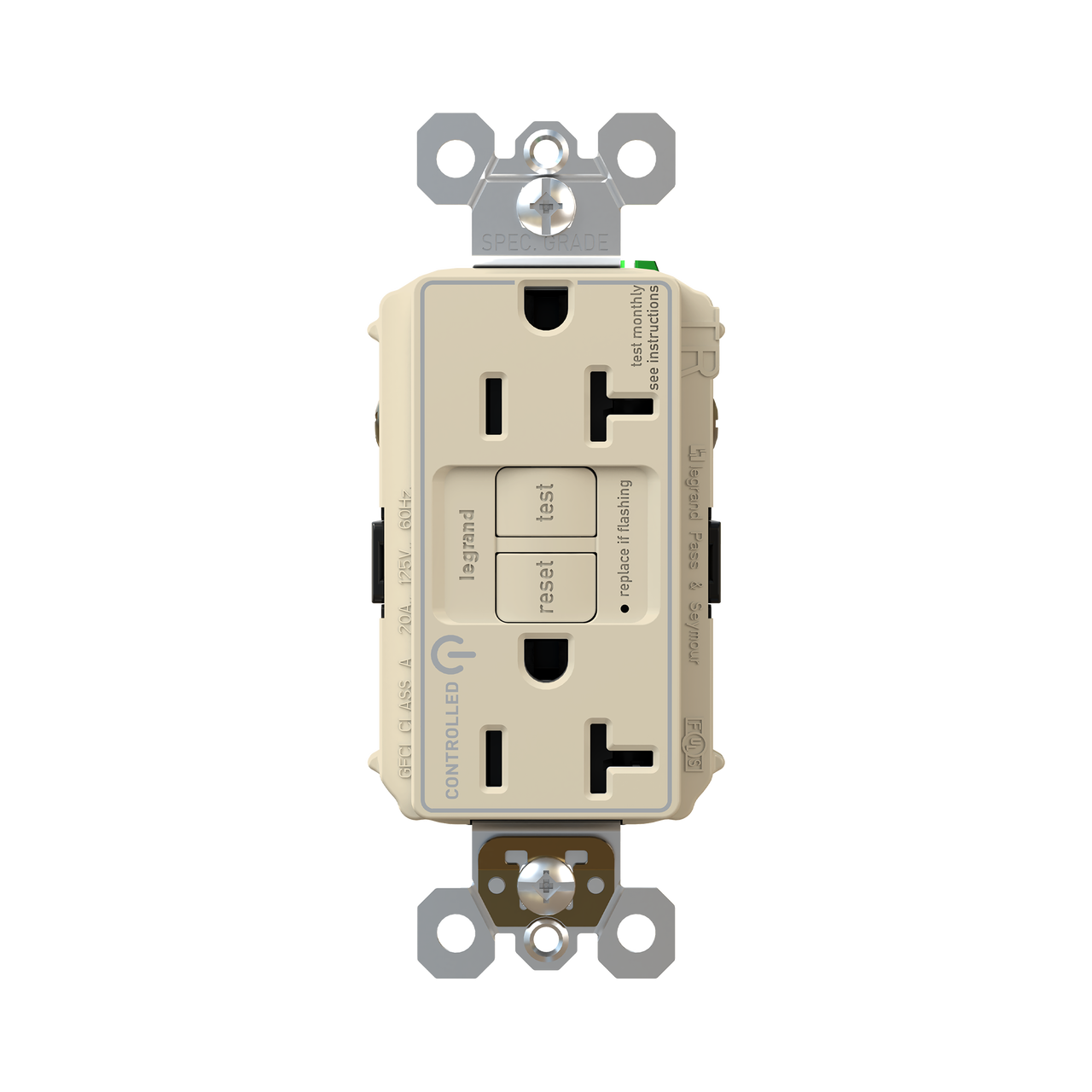 Spec-Grade 20A GFCI receptacle with tamper-resistance, self-tests every 3 seconds.