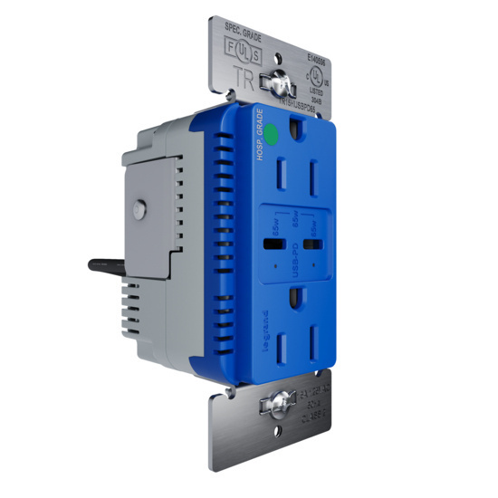 65W Hospital Grade USB Outlet, Type C, 15A, Tamper-Resistant, Blue