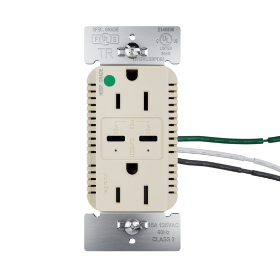 65W Hospital Grade USB Outlet, Type C, 15A, Tamper-Resistant, Ivory