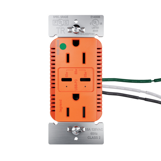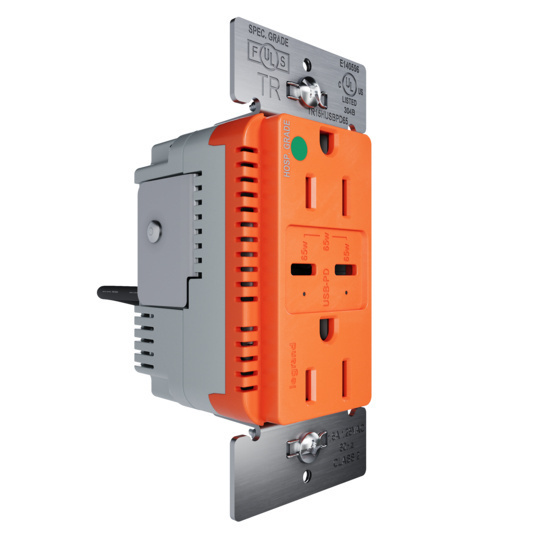 65W Hospital Grade USB Outlet, Type C, 15A, Tamper-Resistant, Orange