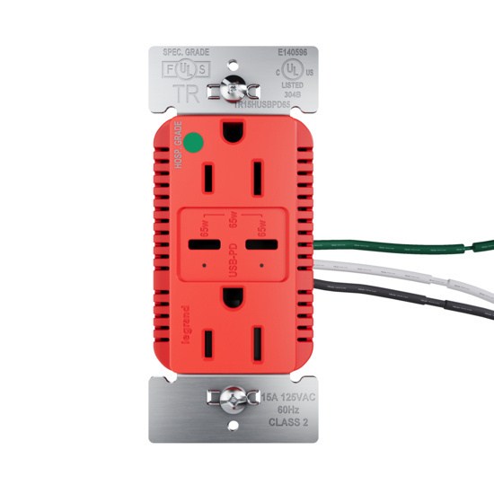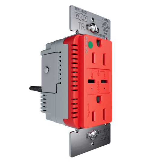 65W Hospital Grade USB Outlet, Type C, 15A, Tamper-Resistant, Red