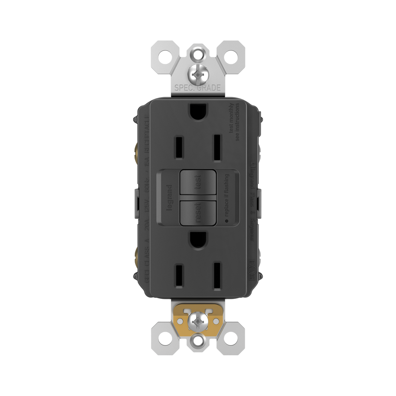 This is a Self-Test GFCI Receptacle with SafeLock Protection™; it conducts an automatic test every three seconds, ensuring it’s always ready to protect. If the device fails the test, the indicator light flashes to signal that the GFCI should be replaced. It also has our proven SafeLock Protection feature: if critical