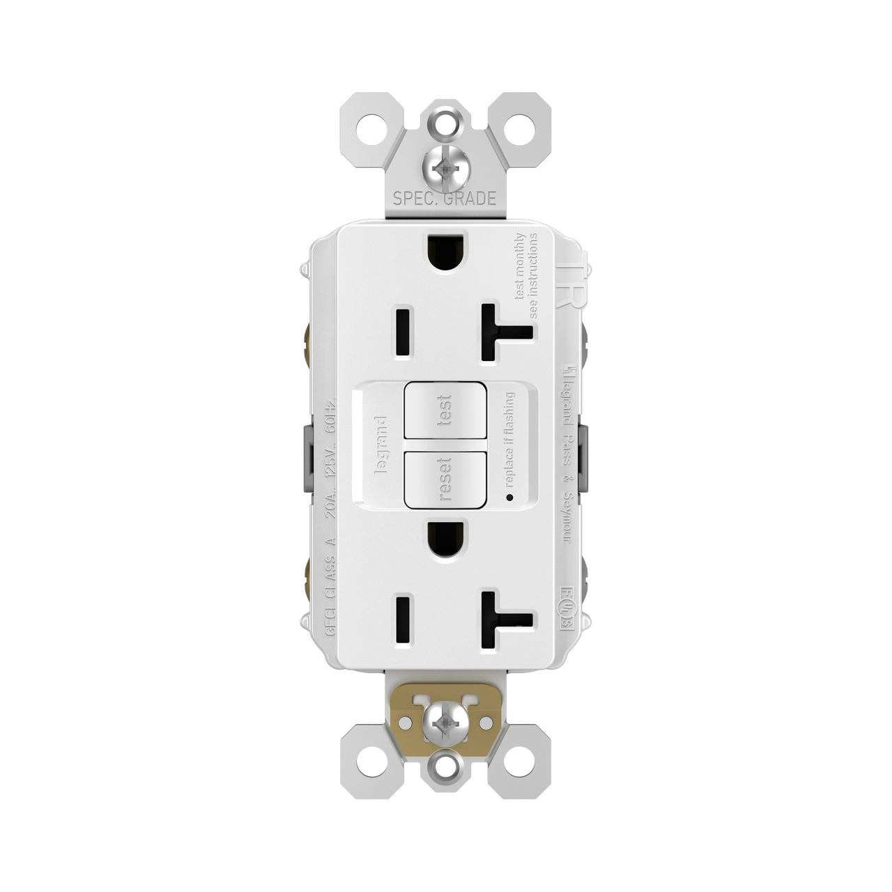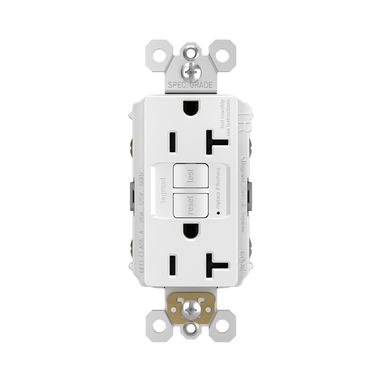 GFCI receptacles from the radiant® Collection self-test automatically every three seconds to ensure reliable protection from shock due to ground fault occurrences. Meeting National Electrical Code requirements for ground fault protection, GFCI receptacles make it easier to recognize and fix trips right where they happen – no more confusion at the breaker box. 20A outlets are ideal for use with larger appliances and in commercial settings, as well as to meet regional requirements (Chicago, Canada). GFCI protection is required by code in bathrooms, kitchens, garages, basements, outdoor areas, and for any other outlets found within six feet of a sink or water source. GFCI outlets should always be used when replacing existing GFCI outlets during renovation. Made exclusively for use with screwless Wall Plates from the radiant® Collection, sold separately. Spec-Grade devices are engineered to meet federal specifications for use in commercial installations.