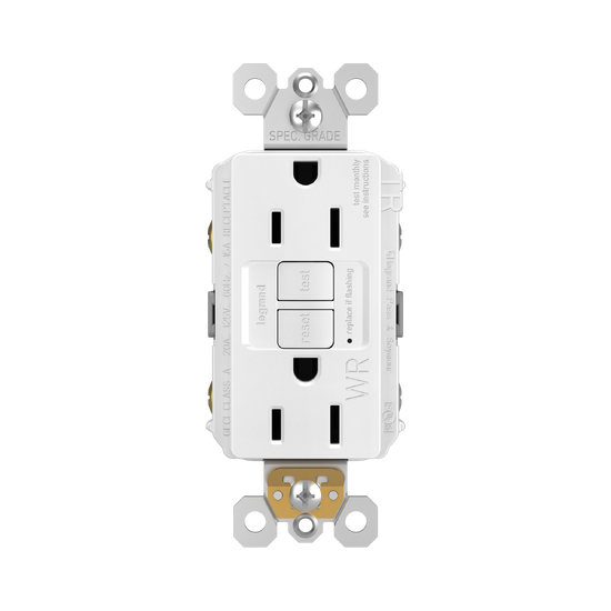 GFCI receptacles from the radiant® Collection self-test automatically every three seconds to ensure reliable protection from shock due to ground fault occurrences. Meeting National Electrical Code requirements for ground fault protection, GFCI receptacles make it easier to recognize and fix trips right where they happen – no more confusion at the breaker box. Also including tamper and weather resistance, this model was designed for use on decks, patios, pool areas, and other outdoor spaces. Maximize safety, in style, with GFCI protection featuring the sleek, clean lines of radiant. GFCI protection is required by code in bathrooms, kitchens, garages, basements, outdoor areas, and for any other outlets found within six feet of a sink or water source. GFCI outlets should always be used when replacing existing GFCI outlets during renovation. Made exclusively for use with screwless Wall Plates from the radiant® Collection, sold separately. Spec-Grade devices are engineered to meet federal specifications for use in commercial installations.