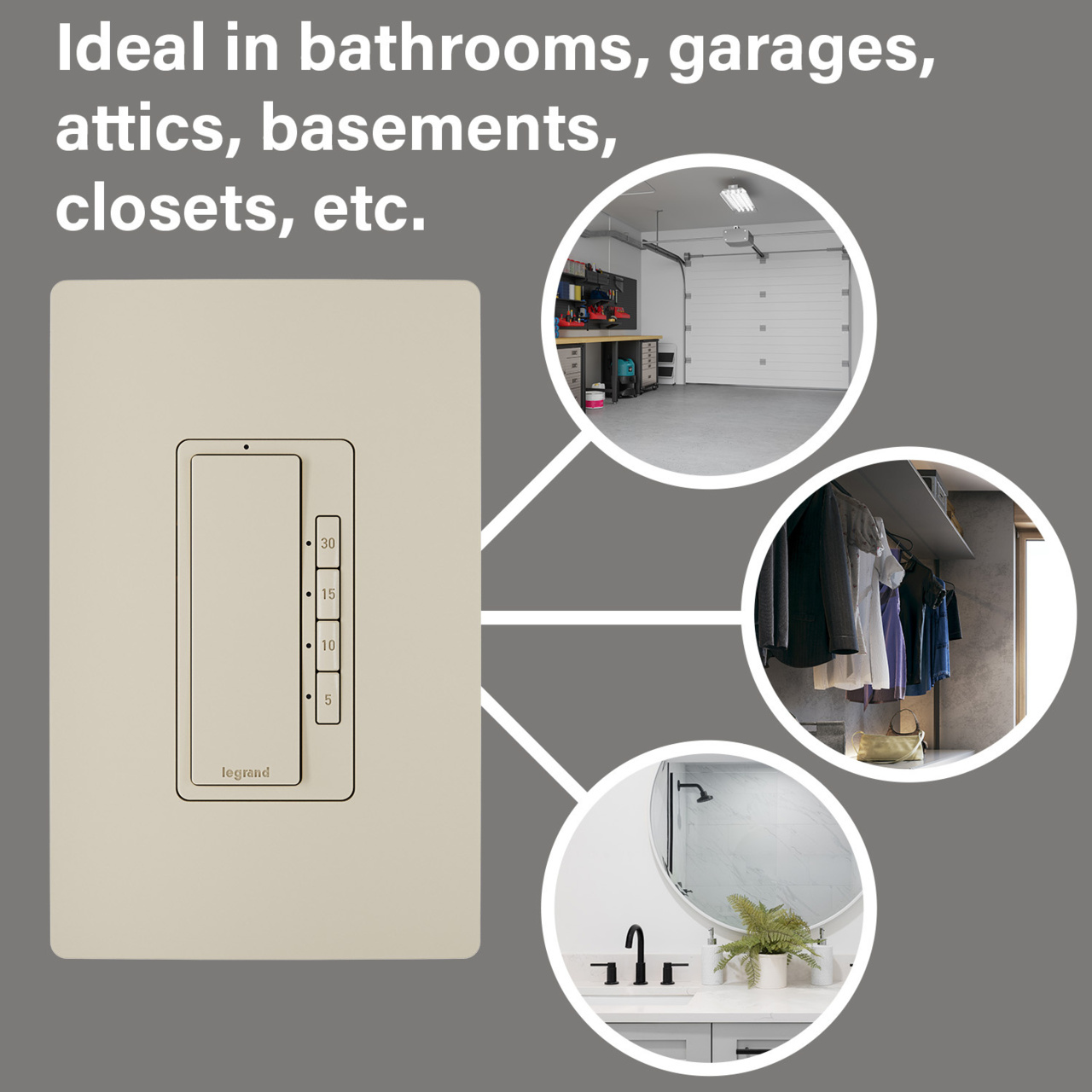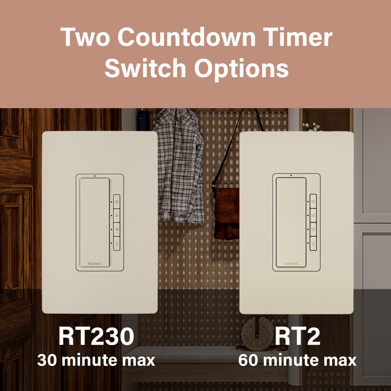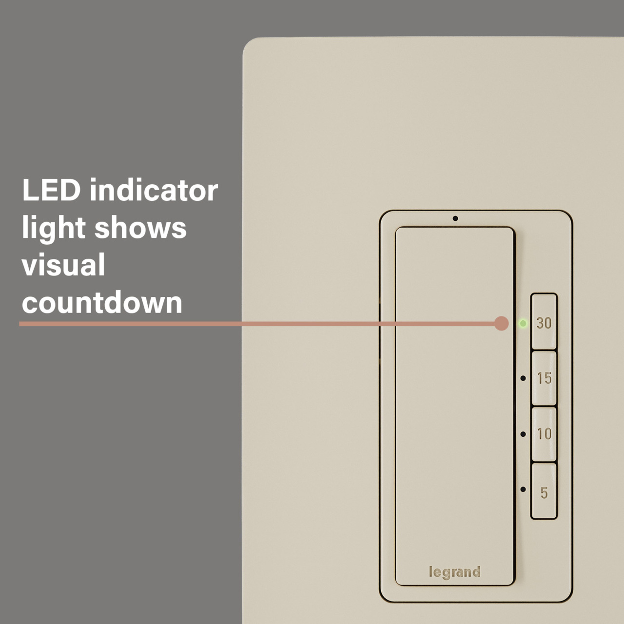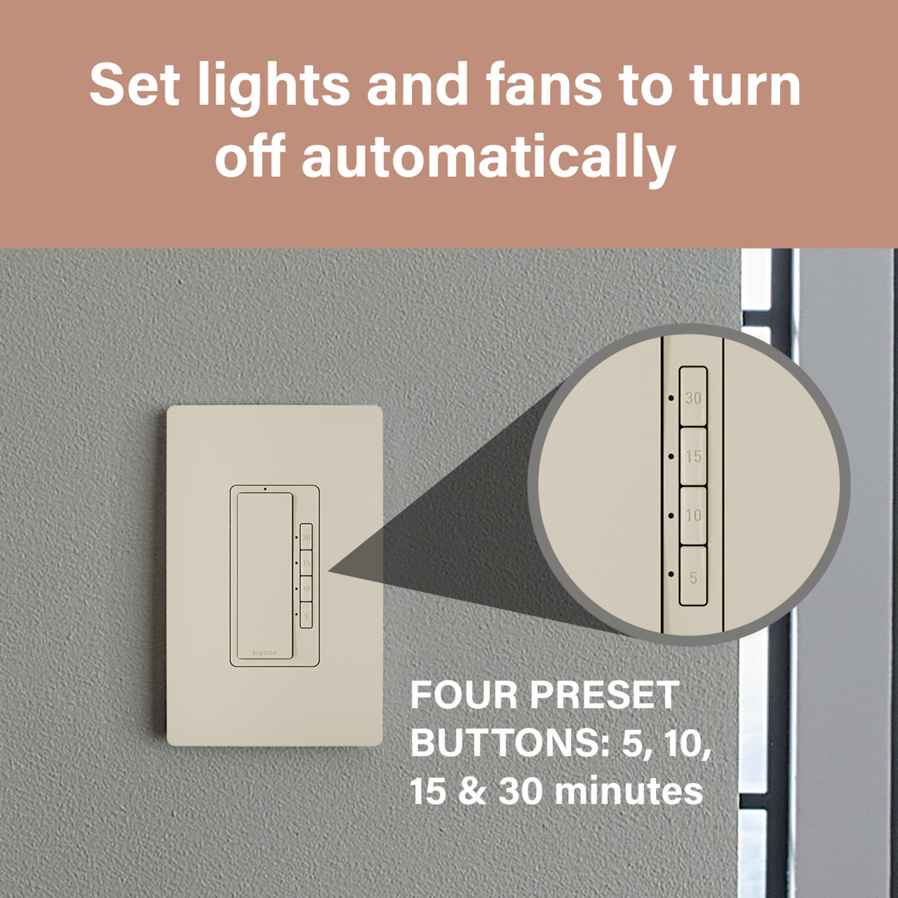 This digital timer switch provides users with easy and automatic control of lighting and fans in garages, bathrooms, attics, closets, pantries and more. With four preset buttons – and timeframes up to 30 minutes – users can rest assured lighting and power in low traffic areas won't be left on unintentionally, and an indicator light shows visual representation of the amount of time remaining. It also includes a manual on/off paddle switch for added convenience. When the switch is off, a locator light illuminates to help users find the switch in the dark. This in-wall countdown timer switch installs easily in place of a standard light or fan switch or older spring-wound timer. As a part of the radiant® Collection, this timer can easily coordinate with matching switches, dimmers and outlets in the same collection. Made exclusively for use with screwless Wall Plates from the radiant Collection, sold separately.