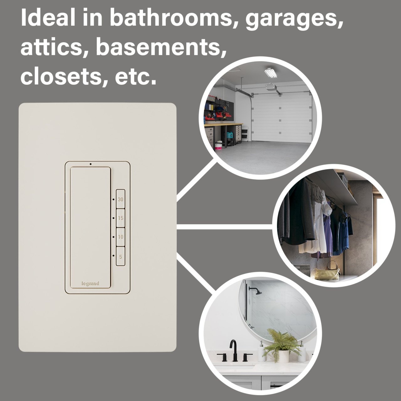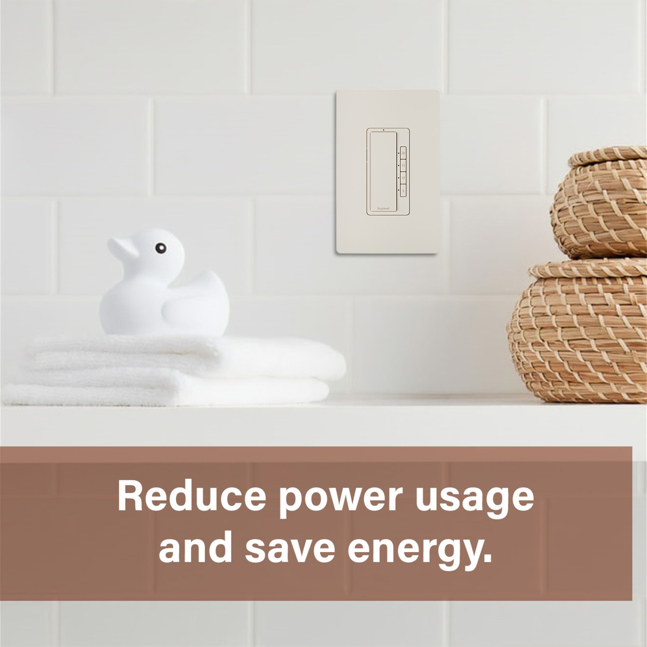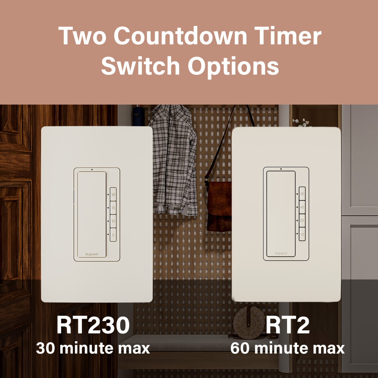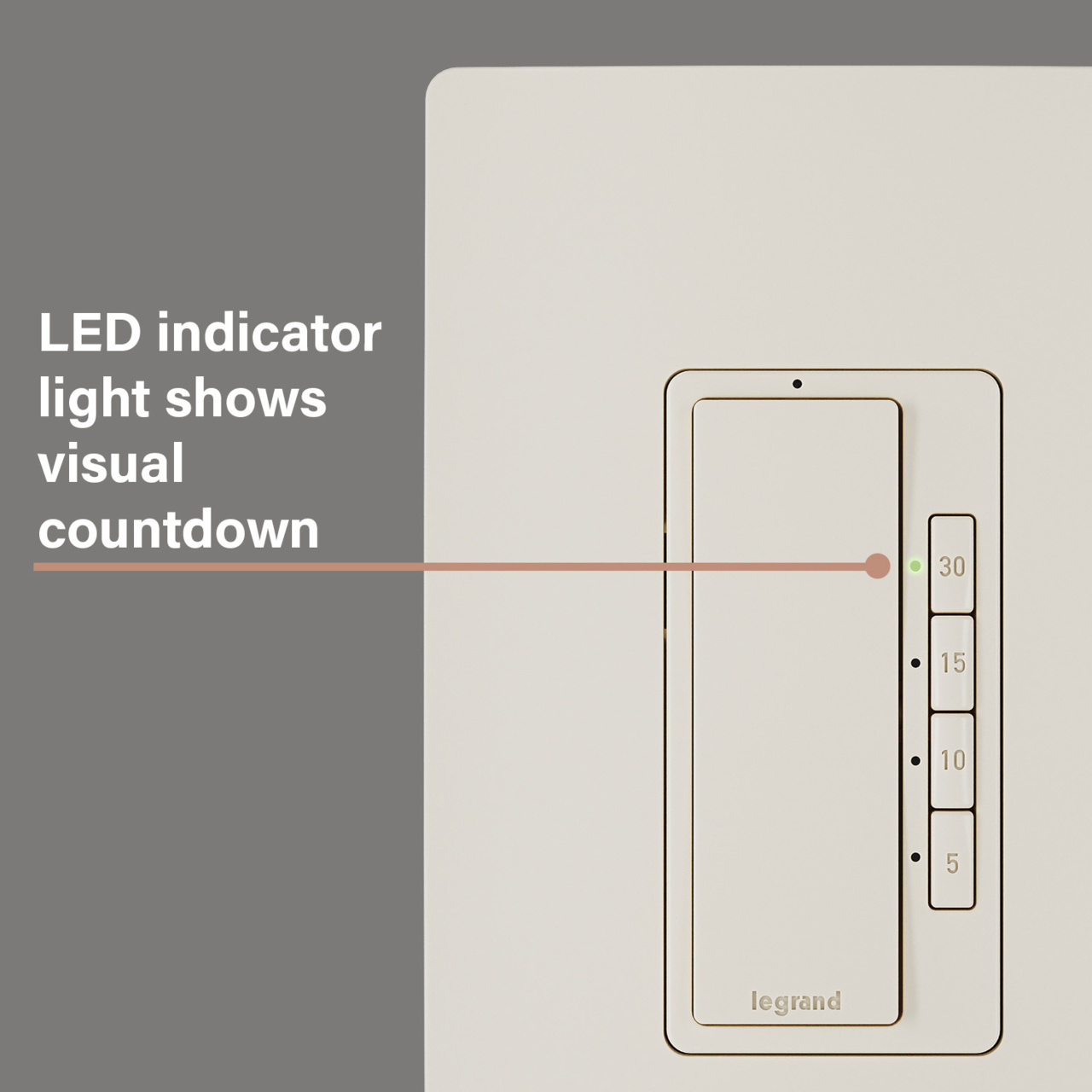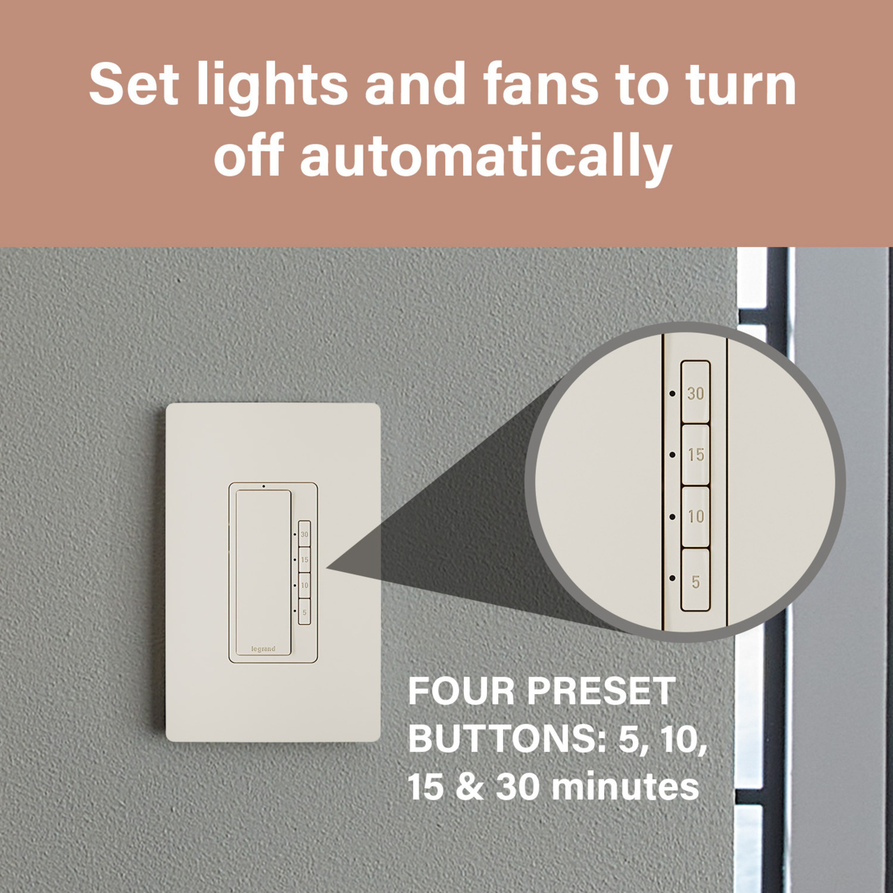 This digital timer switch provides users with easy and automatic control of lighting and fans in garages, bathrooms, attics, closets, pantries and more. With four preset buttons – and timeframes up to 30 minutes – users can rest assured lighting and power in low traffic areas won't be left on unintentionally, and an indicator light shows visual representation of the amount of time remaining. It also includes a manual on/off paddle switch for added convenience. When the switch is off, a locator light illuminates to help users find the switch in the dark. This in-wall countdown timer switch installs easily in place of a standard light or fan switch or older spring-wound timer. As a part of the radiant® Collection, this timer can easily coordinate with matching switches, dimmers and outlets in the same collection. Made exclusively for use with screwless Wall Plates from the radiant Collection, sold separately.